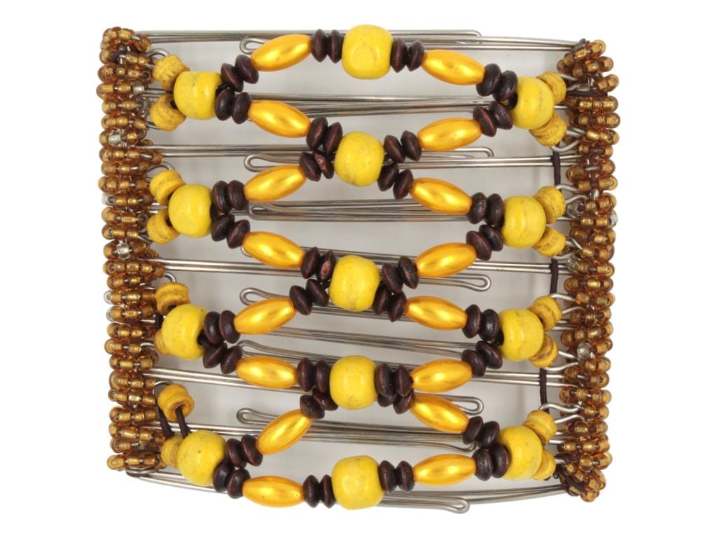 Brighten up your day with this stunning 9 Tong Wire Hair Clip, a radiant accessory that captures the essence of sunshine and warmth. Carefully crafted with a harmonious blend of materials, this piece features small dark chocolate brown wood accent beads that ground the design with subtle sophistication. Luminous yellow pearl beads catch the light beautifully, creating a dazzling effect reminiscent of golden rays. Warm yellow wood beads infuse the clip with an optimistic, cheerful energy that lifts your spirit, while delicate gold seed beads line the edges, twinkling like precious gems in the sunlight. Whether you're styling your hair for everyday elegance or a special occasion, this African-inspired wire hair clip brings joy and radiance to your look. Perfect for anyone seeking to add a touch of warmth, brightness, and natural beauty to their personal style.