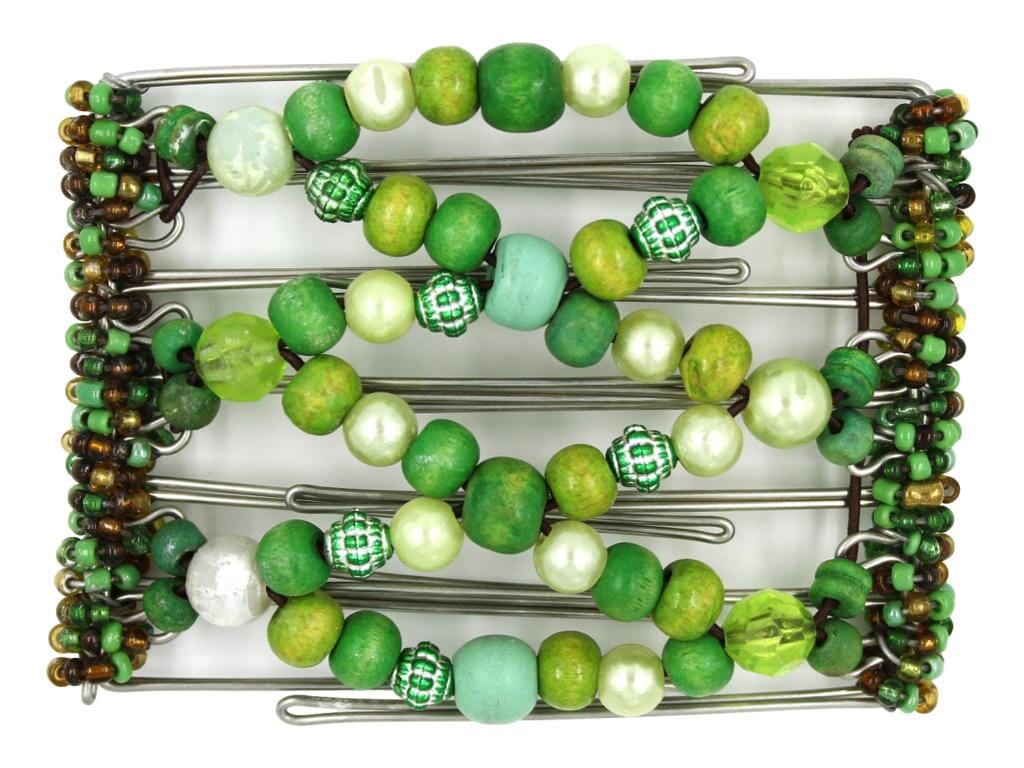 Add a touch of whimsy to your look with this handcrafted 7 Tong Wire Hair Clip, adorned with varying shades of green wood and pearl beads. Earthy rustic wood beads meet classically elegant pearls, capturing the vibrant energy of Spring in every detail.
