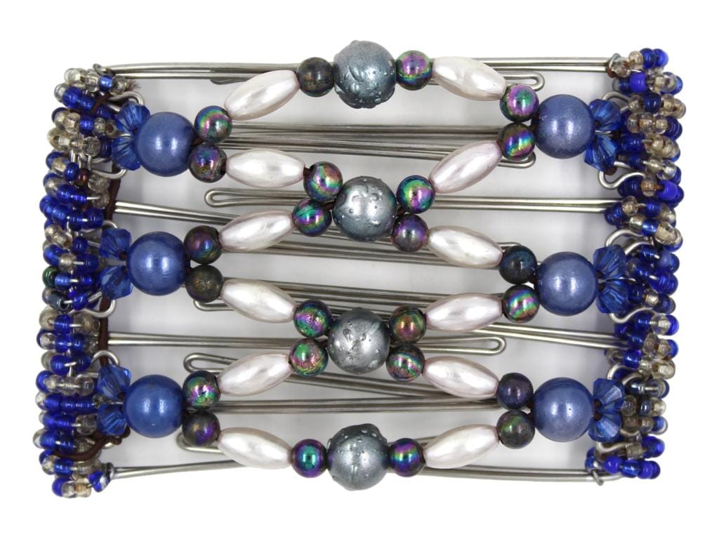 A stunning night sky vibe shines through in this 7 Tong Wire Hair Clip! Dramatic steel blue splatter beads with a dewy wet look steal the show, surrounded by bursts of small rainbow beads that add a playful touch. Light pink pearly beads bring a soft, ethereal contrast, while solid cobalt blue beads add depth. Framing it all, tiny sapphire acrylic beads along the edges add that perfect twinkle—like stars in the night sky. 🌃✨