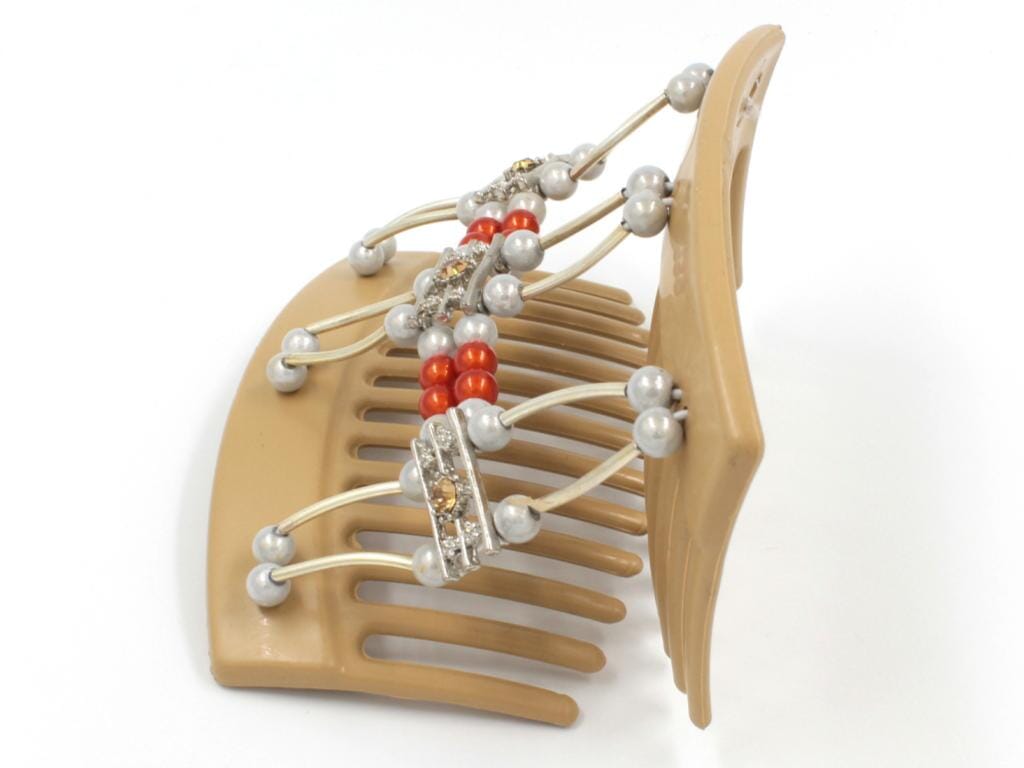 Introducing a stunningly beautiful hair accessory that promises to elevate your overall look and add a touch of elegance and sophistication. This African Butterfly Thick Hair Comb - Flowers Blonde 46 is a one-of-a-kind hair accessory that stands out. At the heart of this exquisite piece are three center silver charms, each glimmering with light amber Swarovski crystals that add just the right amount of sparkle. The charms are perfectly complemented by burnt orange and light gray/silver magic beads that shimmer subtly, reflecting light in the most enchanting way. The silver tube beads finish this stunning Flowers Hair Comb.