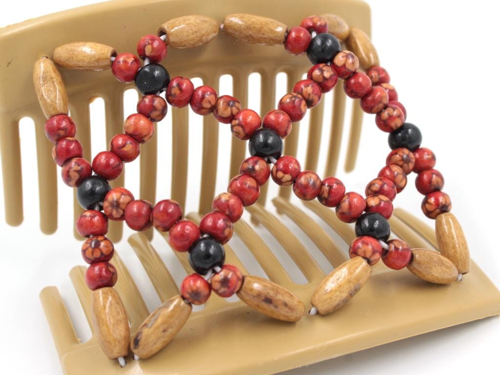 Make a statement with this African Butterfly Ndebele Thick Hair Comb, a vibrant and eclectic accessory perfect for thick hair. This stunning blonde hair comb showcases printed red boho accent wood beads, adding a pop of color and energetic flair. Black accent wood beads provide a sleek contrast, while light brown wood beads along the edges add warmth and depth. Perfect for anyone who embodies free-spirited style, this beautifully crafted hair comb effortlessly styles thicker locks with ease.