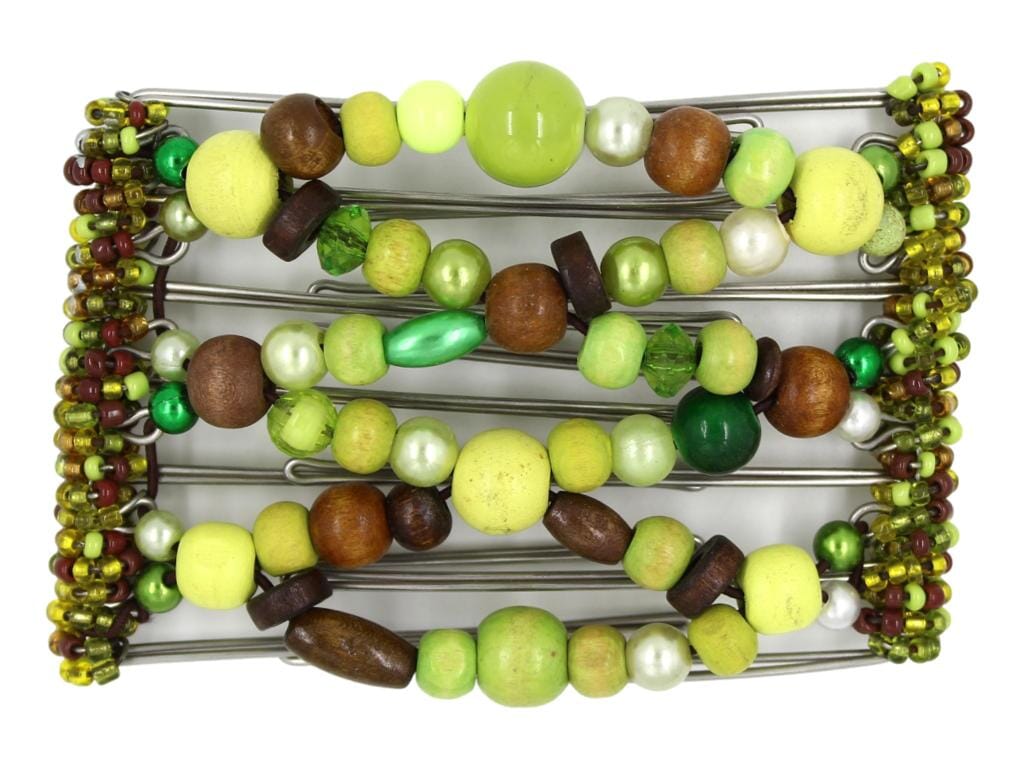 Add a pop of color to your hairstyle with this vibrant 7 Tong Wire Hair Clip featuring a delightful mix of green apple, lime, and brown wood and acrylic beads. The eclectic assortment of wood and acrylic beads adds a unique touch, making it a standout hair accessory for any occasion. Designed for medium thickness to fine hair, this clip not only holds your hair securely but also elevates your look with its playful charm.