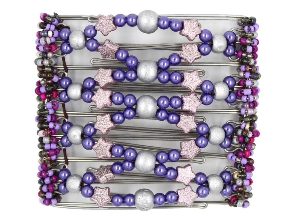 Galactic beauty takes flight with this mesmerizing 9 Tong Wire Hair Clip! ✨ Silver wood beads shine bright in the center, surrounded by dark purple pearly beads that evoke a midnight sky. Shimmering pink star beads add a touch of celestial magic, while a mix of purple and fuchsia beads along the edges of the hair clip brings a pop of vibrant color that's simply captivating!