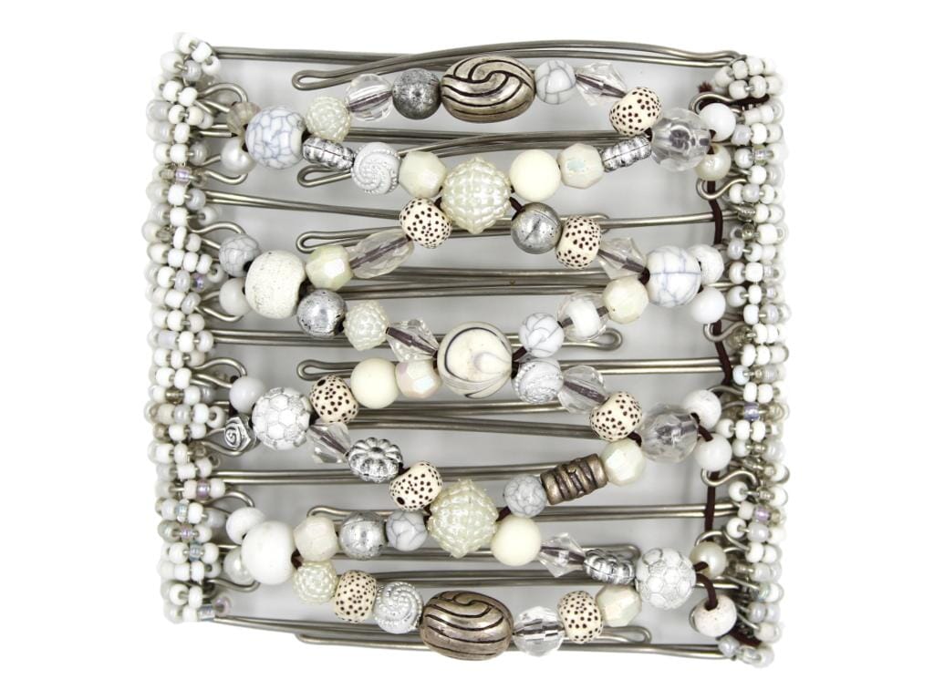This one-of-a-kind African Butterfly 9 Tong Wire Hair Clip is the perfect accessory for any special occasion. It boasts a vibrant mix of clear, white acrylic beads, rustic white and natural wood beads, silver, and luminous white pearly beads. With a variety of shapes and sizes, this hair clip stands out for its beautiful details while still blending in with any shabby chic or boho wedding hair style.