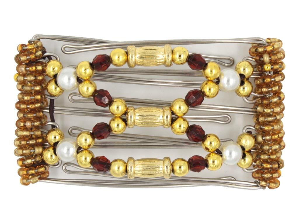 This African Butterfly 5 Tong Wire Hair Clip is beautifully adorned with a mix of decorative center gold beads; small, round gold beads; and a charming blend of burgundy acrylic beads. Accented by delicate white pearly beads, this clip adds a touch of elegance and warmth to your hairstyle. Its intricate design not only secures your hair comfortably but also enhances your look with a unique, handcrafted feel perfect for everyday wear or special occasions. When it comes to handcrafted elegance, creativity, and authenticity, there truly is no match for this unique hair accessory. Embrace the spirit of the season and hold your hair high with a dash of golden sparkle!