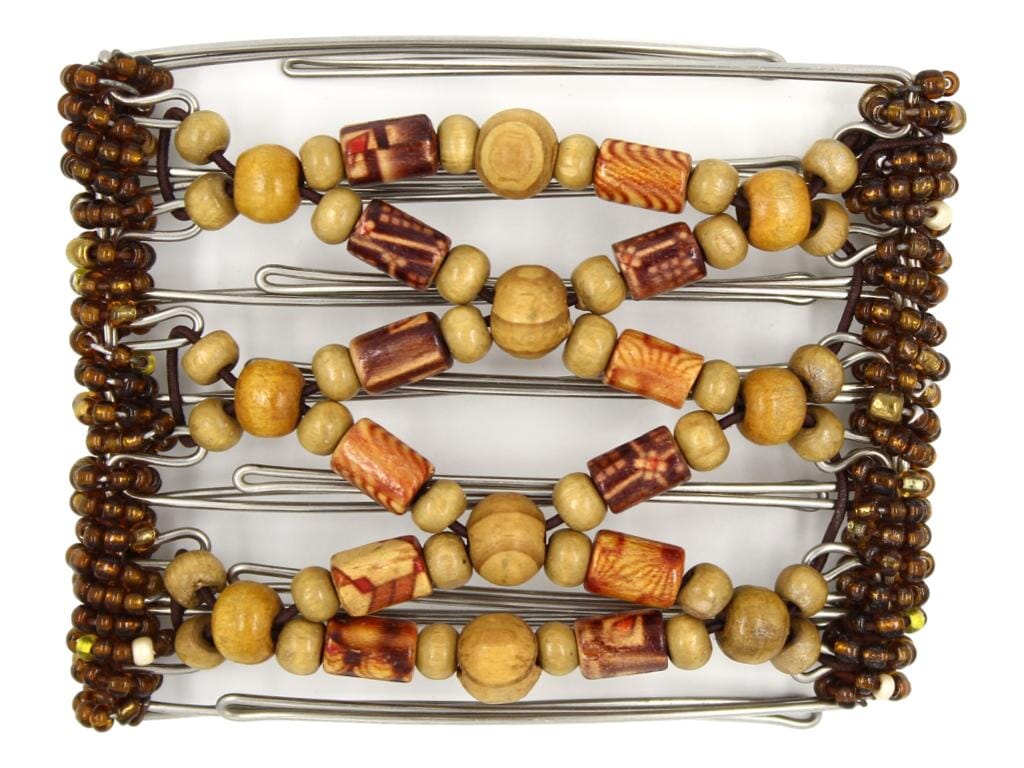 Elevate your bohemian style with this stunning 7 Tong Wire Hair Clip, expertly designed for medium thickness to thin hair. Featuring an exquisite blend of natural boho wood beads and warm honey blonde wood beads, this sturdy hair clip masterfully combines earthy elegance with durable functionality. The perfect fusion of free-spirited charm and practical design, this hair clip effortlessly secures your locks while making a bold fashion statement. Whether you're heading to a music festival, a casual gathering, or just running errands, this hair accessory is sure to turn heads and complement your eclectic style.