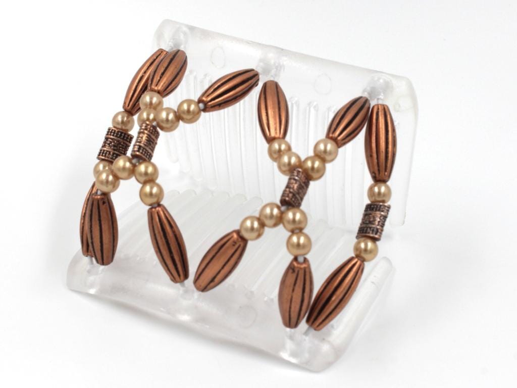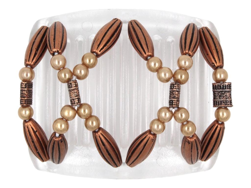 This clear Chameleon Dalena Hair Comb is a masterpiece of design, featuring copper beads at its center that radiate warmth and sophistication. Surrounding the copper beads are lustrous gold pearl beads that add a touch of luxury and glamour, catching the light with every movement. Along the edges, copper beads with intricate black etchings bring a level of depth and visual interest, creating a stunning contrast that elevates any hairstyle to new heights of elegance. The clear comb base provides a sleek and modern touch, allowing the rich tones of the copper and gold to take center stage. This hair comb is perfect for making a statement, whether you're dressing up or adding a touch of sophistication to a more casual look.