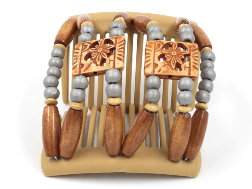 This Blonde Chameleon Dupla Hair Comb is designed with a harmonious blend of natural and metallic tones, creating a look that is both elegant and distinctive. Light brown tribal center beads serve as the focal point, drawing the eye with their intricate design. Silver wood beads add a subtle, modern shimmer, while cream wood accent beads introduce a soft, refined touch. Medium brown wood beads line the edges of the comb, providing a warm and balanced frame. This medium-sized hair comb is perfect for adding a touch of bohemian sophistication to any hairstyle, making it an ideal accessory for both everyday wear and special occasions.