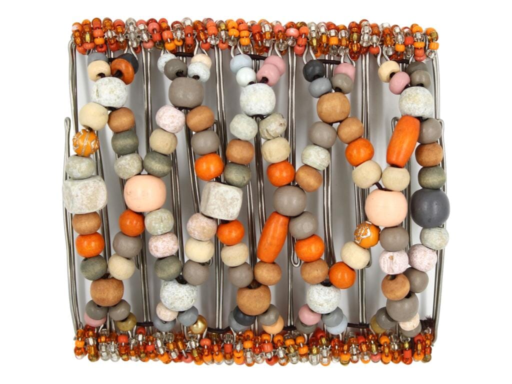 This African Butterfly Wire Hair Clip 11 Tong 494 is a stunning accessory that blends natural warmth with vibrant flair. It features a mix of autumn orange and gray colored wood beads that evoke the cozy feel of fall leaves, while bright orange and clear seed beads line the edges of the clip, adding a pop of energetic color and subtle sparkle. This elegant design makes the hair clip perfect for adding a touch of seasonal style to any look.