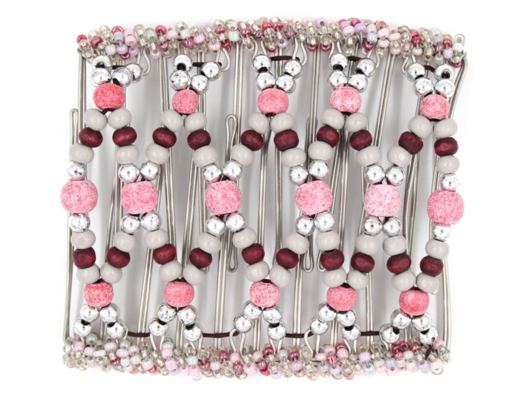 This 11 Tong Wire Hair Clip features large and small red faux stone beads, lots of little silver beads, gray woods, and stonewashed cranberry woods.