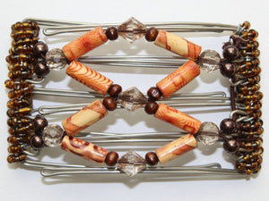 This comb features smokey brown acrylic beads, patterned wooden beads, small wooden beads, and finished with Merlot colored pearls.