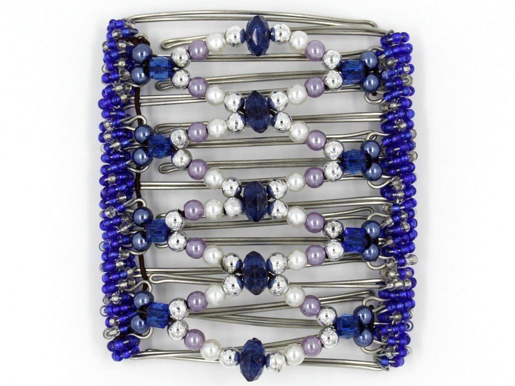 This 9 Tong Wire comb features a lovely blue tone, with sapphire acrylic main beads and accents, as well as shiny silver beads, and lavender, navy, and white pearls.