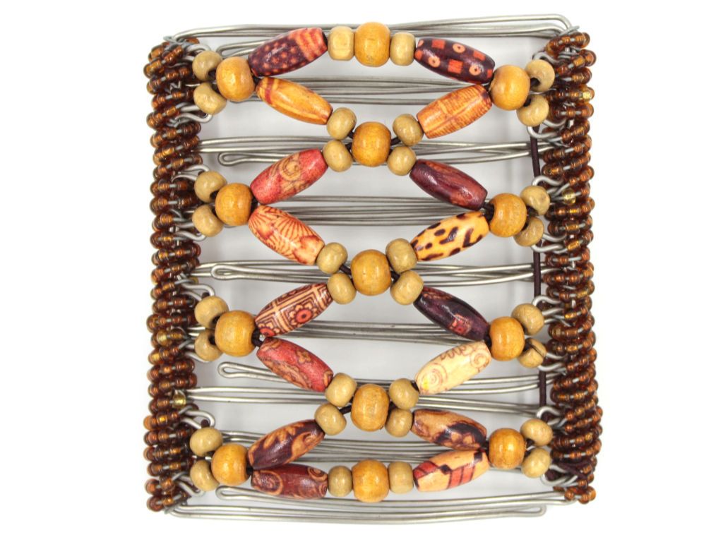 This 9 Tong Wire comb features honey colored boho style wood beads.