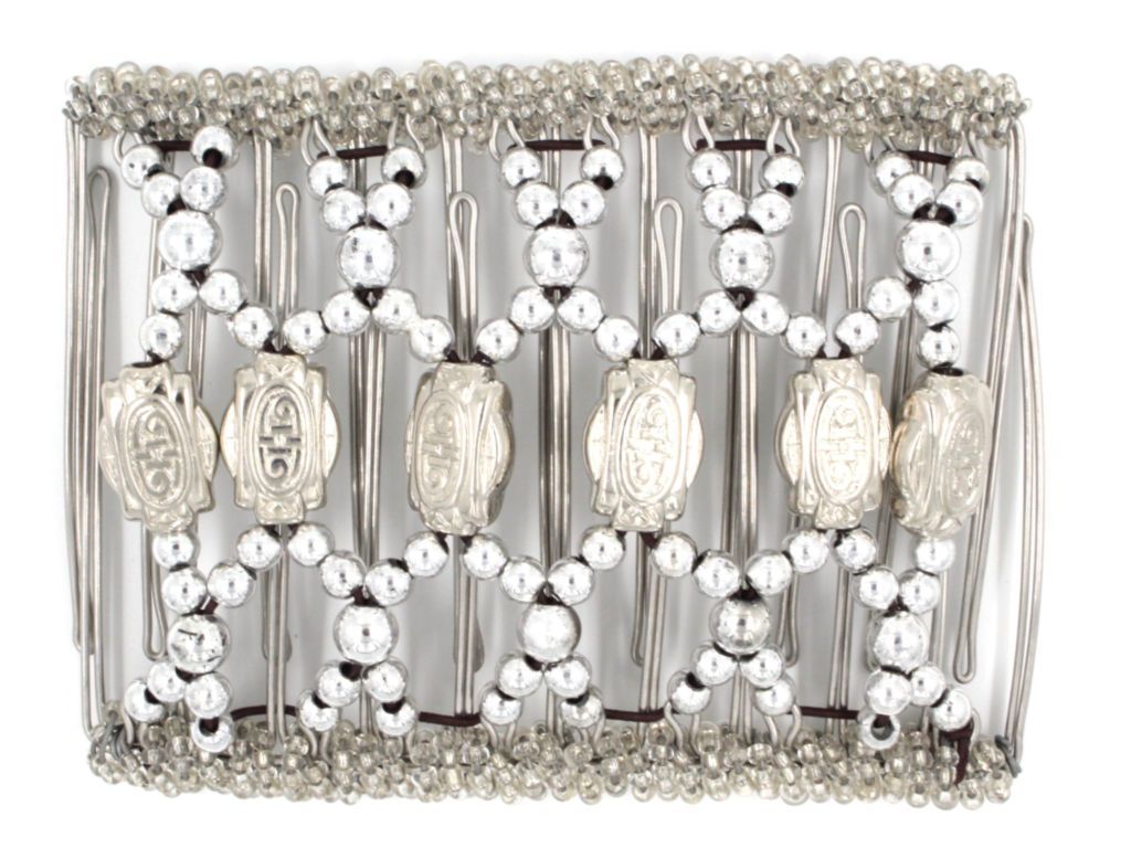 This 11 Tong Wire Clip features small and large silver beads and large silver puffed center decorative beads. This is one stunning, versatile comb and is one of our most popular! It's beautiful and elegant and would be perfect to wear for your wedding day!
