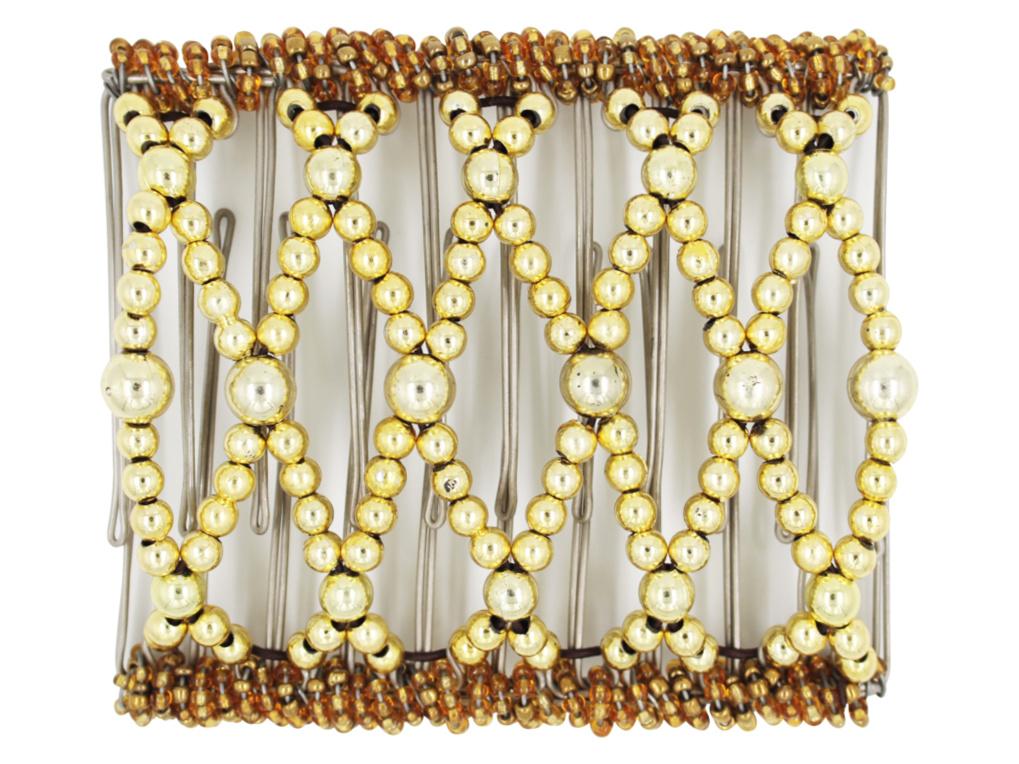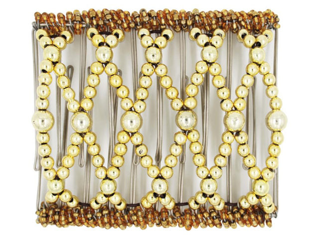 This 11 Tong Wire Hair Clip features all sparkling gold beads. What a fun and festive hair clip! Note: Bead color may have a slight variation from those displayed due to different devices.