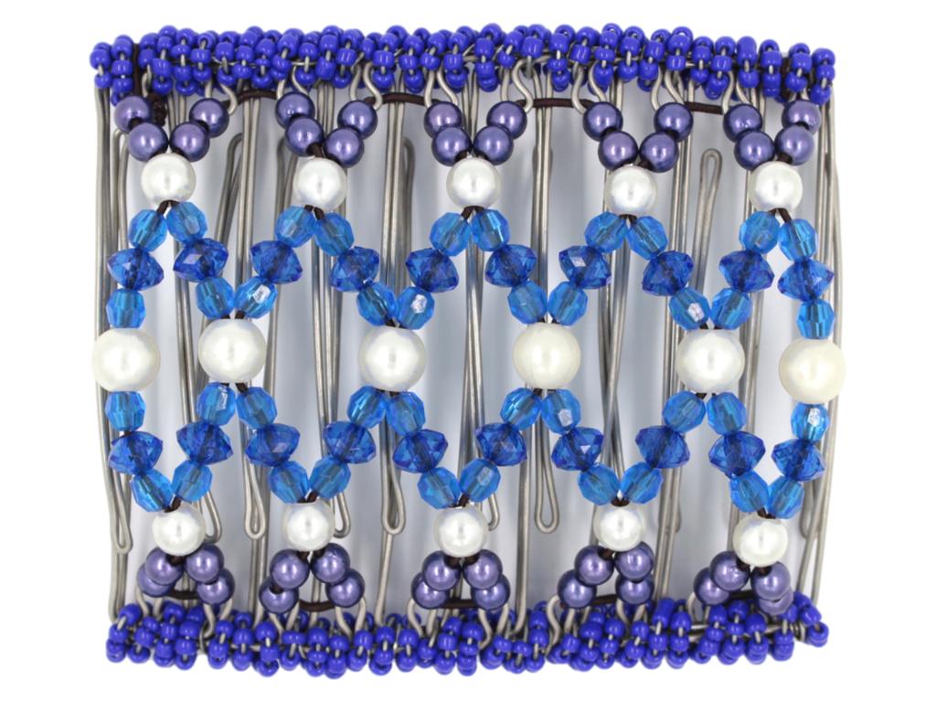 This 11 Tong Wire Hair Clip features large and small white pearl beads, sapphire and royal blue acrylic beads, midnight blue pearly beads, as well as bright blue seed beads along the edges of the clip. This is one stunning hair clip! Note: Bead color may have a slight variation from those displayed due to different devices.Our 11 Tong Wire Hair Clip is approximately 4 1/2" in length and is best suited for the thickest and longest of hair. This size hair clip is great for firmly holding buns or braided hair.