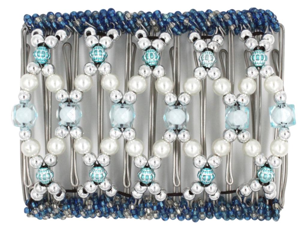 This 11 Tong Wire Hair Clip features aqua translucent center beads, white pearl beads, decorative teal beads, as well as lots of shiny silver beads. This is one stunning hair clip! Note: Bead color may have a slight variation from those displayed due to different devices.Our 11 Tong Wire Hair Clip is approximately 4 1/2" in length and is best suited for the thickest and longest of hair. This size hair clip is great for firmly holding buns or braided hair.
