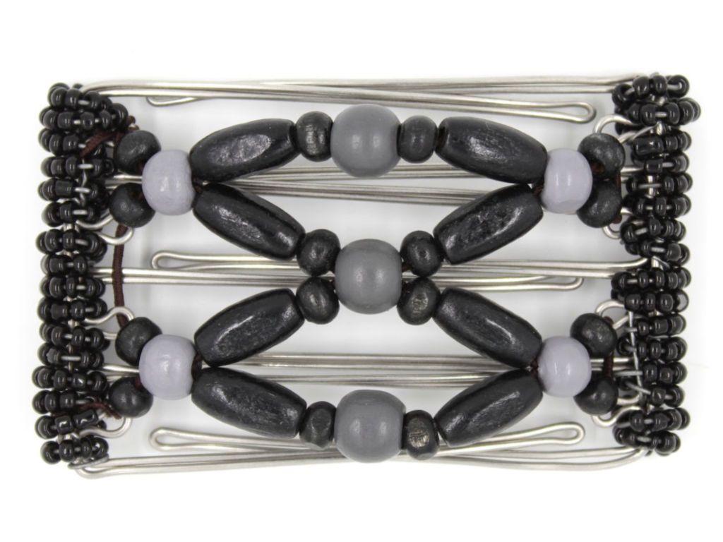 This 5 Tong Wire Clip simply features two shades of gray and black wood beads.