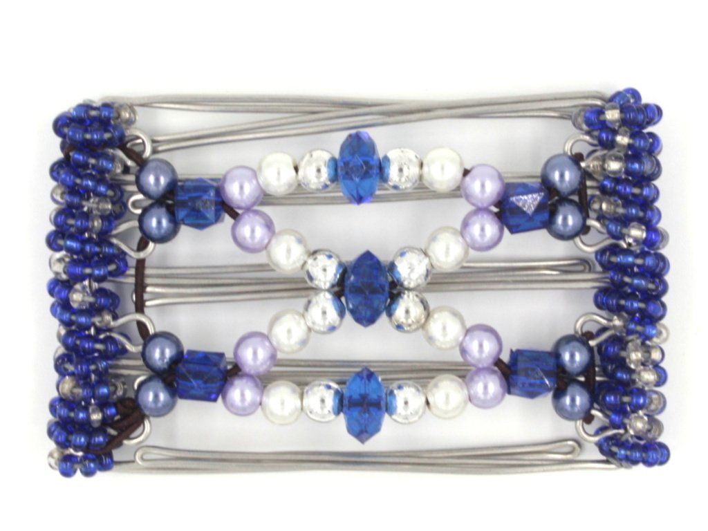 This 5 Tong Wire Clip features a lovely blue tone with sapphire acrylic main beads and accents, as well as shiny silver beads, and lavender, navy, and white pearls.