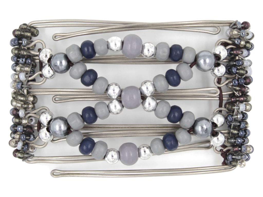 This ocean inspired 5 Tong Wire Clip features matte dark gray wood beads, along with shiny silver, matte midnight blue woods, and gunmetal pearls. Note: Bead color may have a slight variation from those displayed due to different devices.