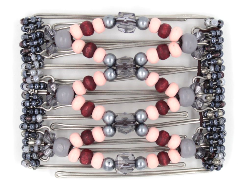 This 7 Tong Wire Clip has a rustic feel with its large and small smoky grey acrylic beads, gunmetal pearls, stonewashed coral peach and wine colored woods, and matte grey wood beads.