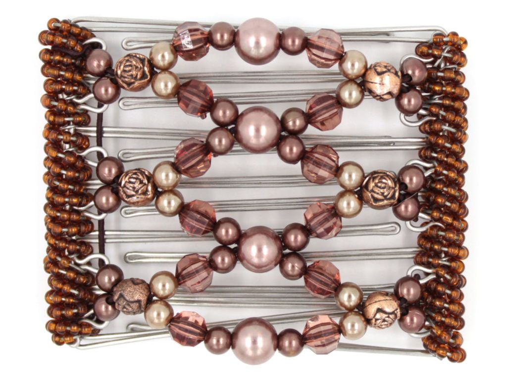 This 7 Tong Wire Clip features rich chocolate brown tones with light brown acrylics, small and large brown pearls, and small copper rose accents.