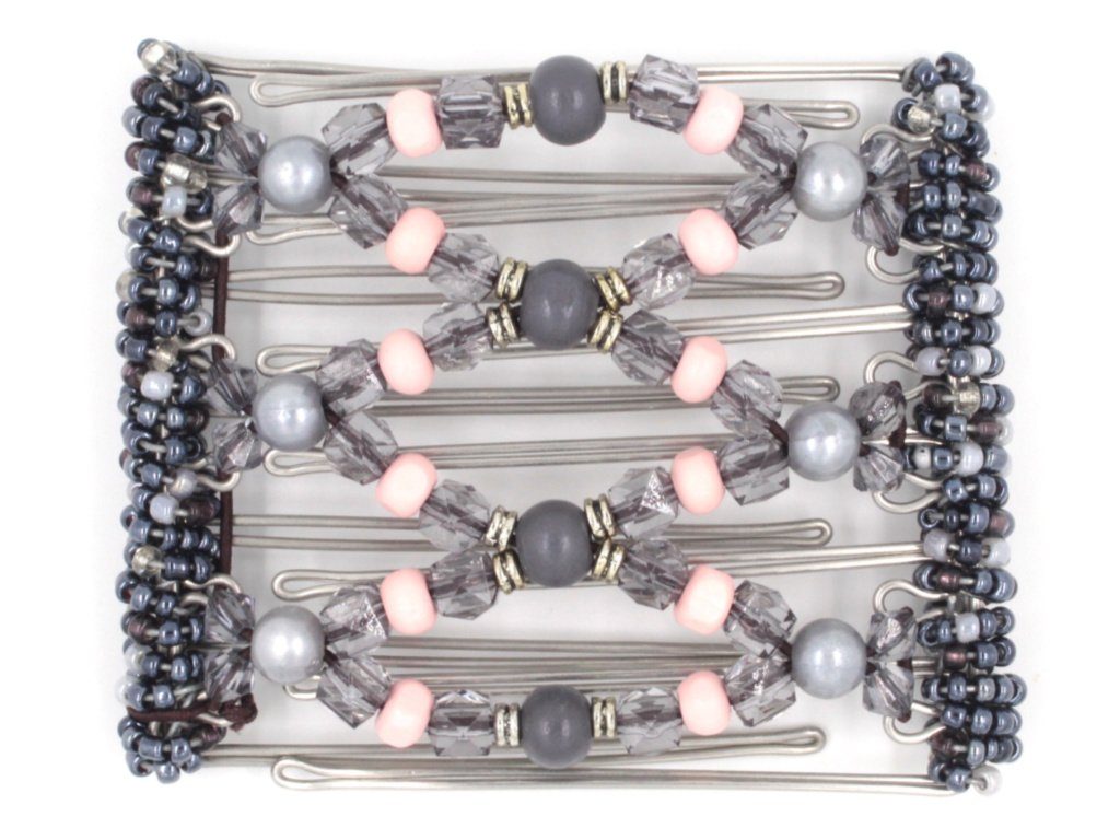 This 7 Tong Wire Clip features matte charcoal gray and coral peachy pink woods, silver accents, large and small smoky grey acrylic beads, and light grey pearly beads. Note: Bead color may have a slight variation from those displayed due to different devices.