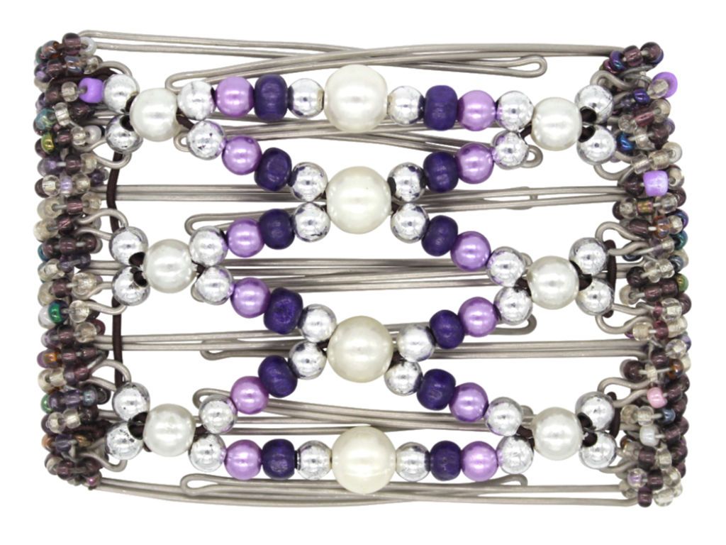 This 7 Tong Wire Hair Clip features large and small white pearls, periwinkle pearly beads, silver shiny beads, and gorgeous violet accent beads. Note: Bead color may have a slight variation from those displayed due to different devices.