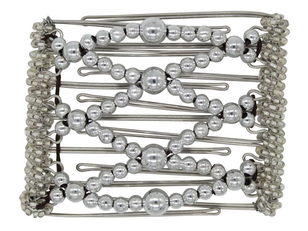 This 7 Tong Wire Hair Clip features all lovely silver beads. This is a popular choice because of its simplicity and will look good in any hair color. Note: Bead color may have a slight variation from those displayed due to different devices.