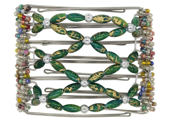 This 7 Tong Wire Comb features evergreen oblong beads with gold swirls. Shiny silver accent beads are also included in this hair clip. Note: Bead color may have a slight variation from those displayed due to different devices.