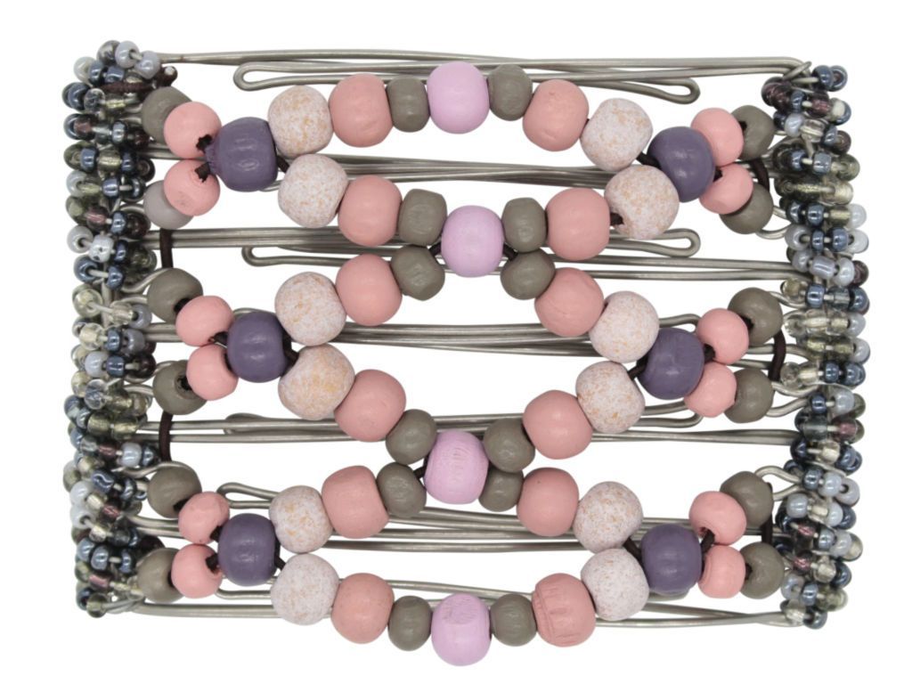 This 7 Tong Wire Hair Clip features dainty pastels, including putty, light gray, peach, heather purple, and soft pink. Note: Bead color may have a slight variation from those displayed due to different devices.