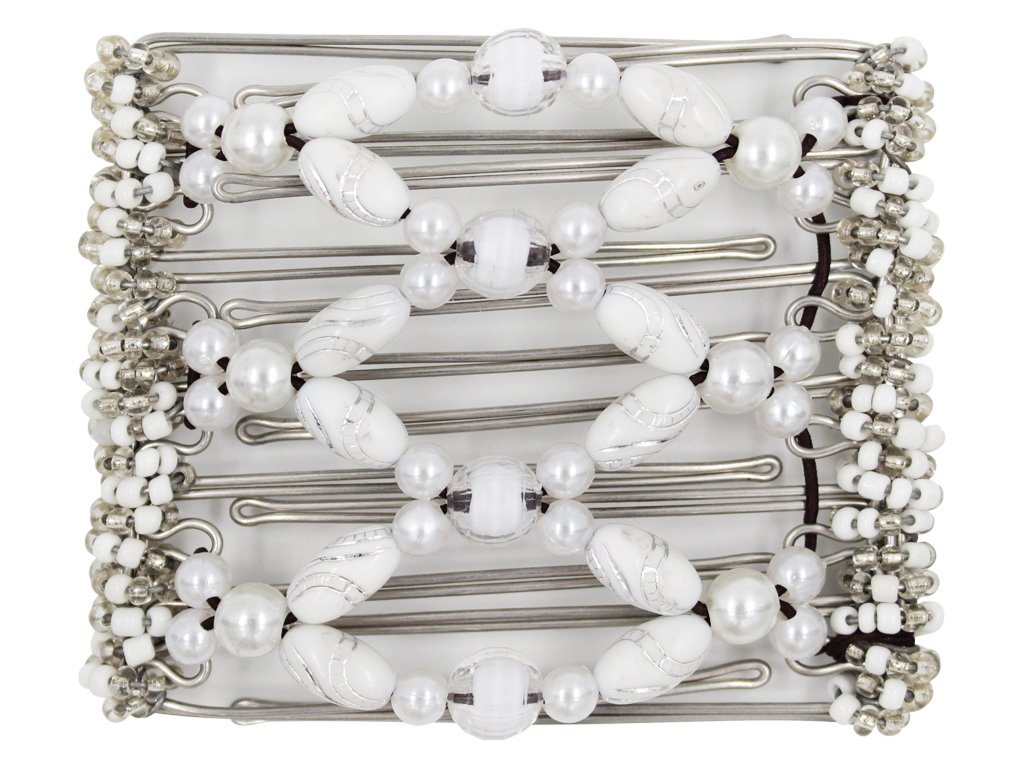 This 7 Tong Wire Hair Clip features all white beads. Clear faceted translucent acrylics, white and silver beads, as well as white pearls are featured in this stunning hair clip. This clip is perfect for wedding or bridal. This is also one of our more popular clips due to its simplicity. Note: Bead color may have a slight variation from those displayed due to different devices.
