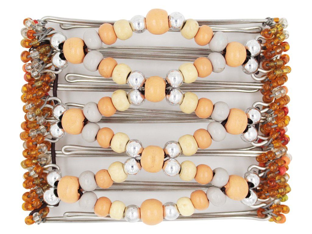 This 7 Tong Wire Hair Clip features apricot, beige, medium gray wood beads, as well as silver beads. Note: Bead color may have a slight variation from those displayed due to different devices.