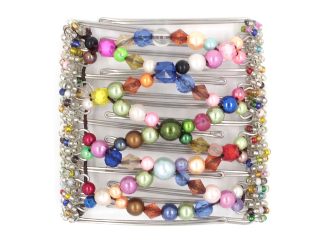 This 9 Tong Wire comb features different types, shapes, and colors of beads. It is one of our most popular combs due to its versatility. This truly is a one-of-a-kind hair clip.