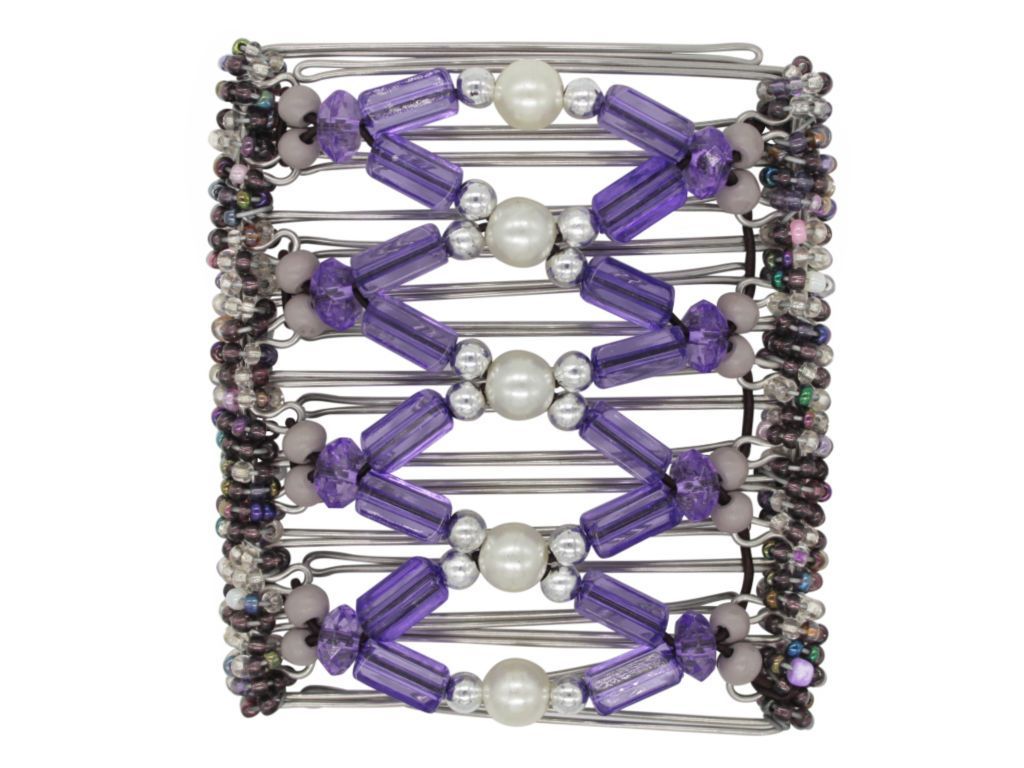 This 9 Tong Wire Hair Clip features gorgeous amethyst acrylic beads; large white pearls; shiny silver beads; and small, matte silver lavender woods. Note: Bead color may have a slight variation from those displayed due to different devices.