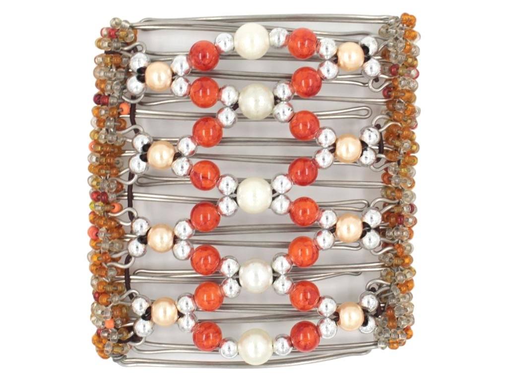This 9 Tong Wire Hair Clip features large white pearl beads, bright sunburst orange marble beads, small silver beads, and buttercream colored pearls. Note: Bead color may have a slight variation from those displayed due to different devices.