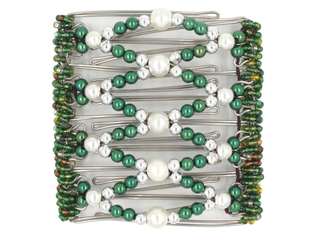 This 9 Tong Wire Hair Clip features lots of gorgeous kelly green beads; large white pearl beads; and tiny, shiny silver beads. Will this hair clip bring you good luck? Note: Bead color may have a slight variation from those displayed due to different devices.