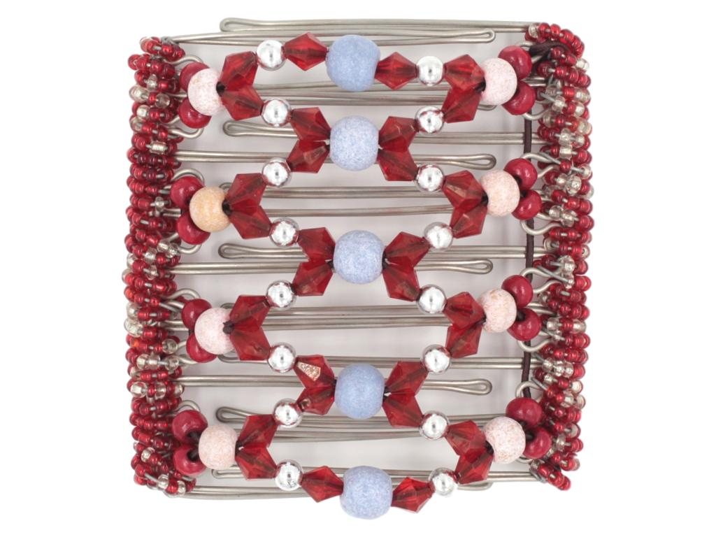 This 9 Tong Wire Hair Clip features navy blue faux stone center beads, dark red acrylic beads, small shiny silver beads, light salmon faux stone beads, and tiny cherry red wood beads. Note: Bead color may have a slight variation from those displayed due to different devices.