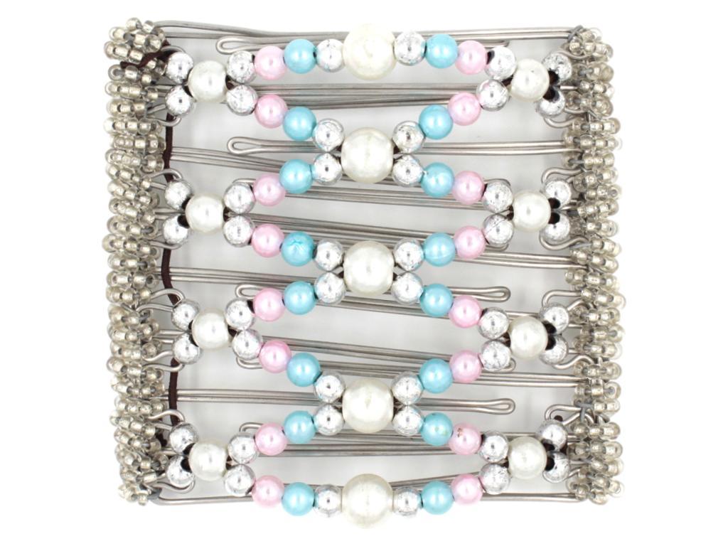 This 9 Tong Wire Hair Clip features white, baby blue, and light pink pearl beads, as well as small silver beads. Note: Bead color may have a slight variation from those displayed due to different devices.