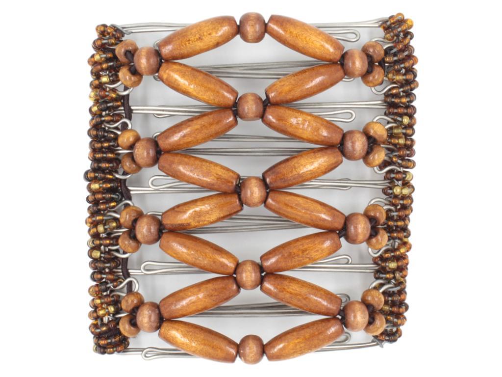 This 9 Tong Wire Hair Clip features all honey wood beads. This is a very popular hair clip due to its simplicity. Note: Bead color may have a slight variation from those displayed due to different devices.