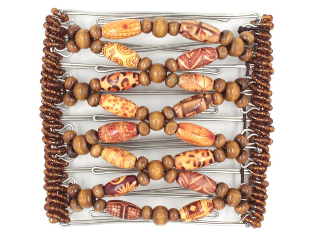 This 9 Tong Wire Hair Clip features medium brown natural woods with gorgeous printed boho wood accent beads. Note: Bead color may have a slight variation from those displayed due to different devices.