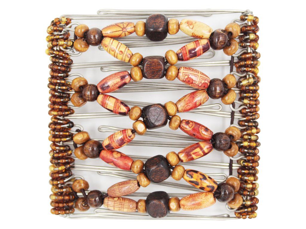 This 9 Tong Wire Hair Clip features medium brown natural woods with gorgeous printed boho wood accent beads. Note: Bead color may have a slight variation from those displayed due to different devices.