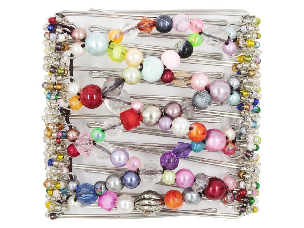 This 9 Tong Wire Hair Clip features different types, textures, shapes, and colors of beads. It is one of our most popular hair clips due to its versatility. This truly is a one-of-a-kind hair clip. Note: Bead color may have a slight variation from those displayed due to different devices.