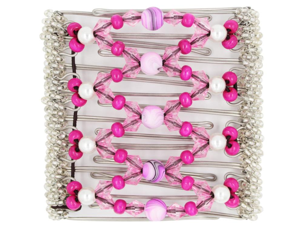 Pretty in Pink! This 9 Tong Wire Hair Clip features pink marble swirl center beads, dark pink acrylic bicone beads, lots of tiny fuchsia wood beads, and white pearl beads. Note: Bead color may have a slight variation from those displayed due to different devices.