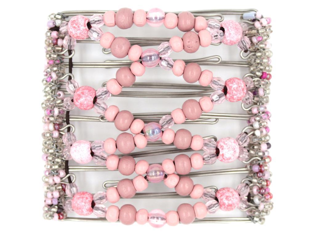This 9 Tong Wire Hair Clip features pretty pink beads, including cotton candy and mauve woods, faux stone strawberry colored wood beads, as well as iridescent center pink beads Note: Bead color may have a slight variation from those displayed due to different devices.