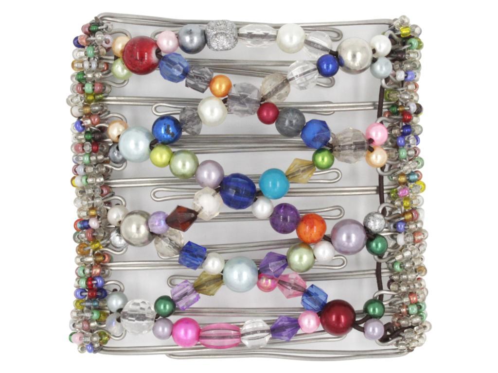 This 9 Tong Wire Hair Clip features different types, textures, shapes, and colors of beads. It is one of our most popular hair clips due to its versatility. This truly is a one-of-a-kind hair clip. Note: Bead color may have a slight variation from those displayed due to different devices.