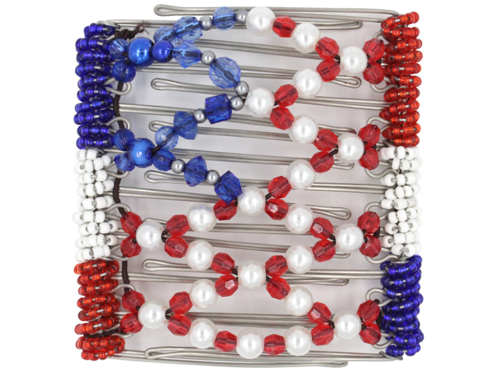 This 9 Tong Wire Hair Clip displays the American flag to celebrate our great country. Wearing this hair clip is one small way to show your patriotism and pay tribute to the men and women who have given their lives while serving in our nation's armed forces. Note: Bead color may have a slight variation from those displayed due to different devices.