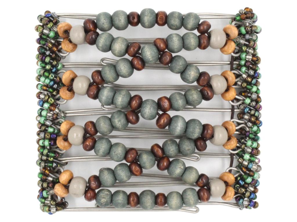 This 9 Tong Wire Hair Clip features a rustic look with all wood beads in army green, dark brown, honey brown, and gray. This hair clip is perfectly paired with blue jeans! Note: Bead color may have a slight variation from those displayed due to different devices.