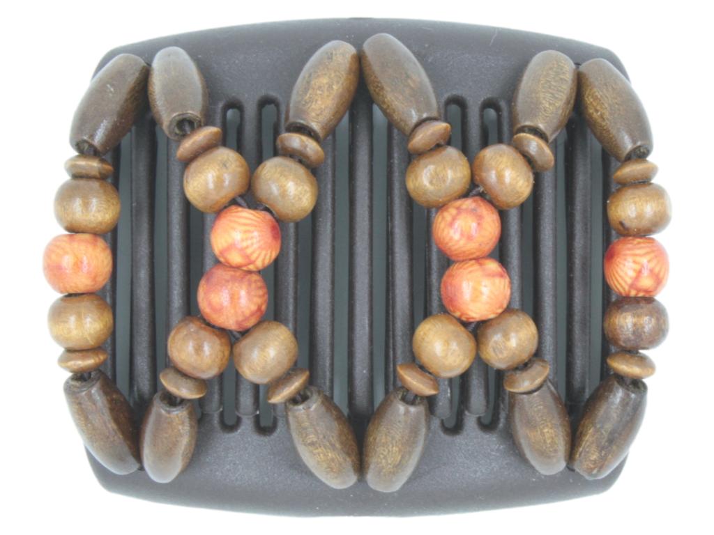This brown Chameleon Beada Hair Comb features medium dark brown wood beads, as well as printed boho wood accent beads. NOTE: Bead color may have a slight variation from those displayed due to different devices.