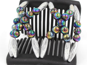 Transform your hair styling routine with our unique Dalena Chameleon Hair Comb, designed for medium thickness to fine or thin hair. This hair comb showcases a stunning arrangement of rainbow beads that add a pop of color, complemented by beautifully etched silver accents along the edges. This unique combination not only brings a touch of elegance to your hairstyle but also radiates a playful charm perfect for any occasion.